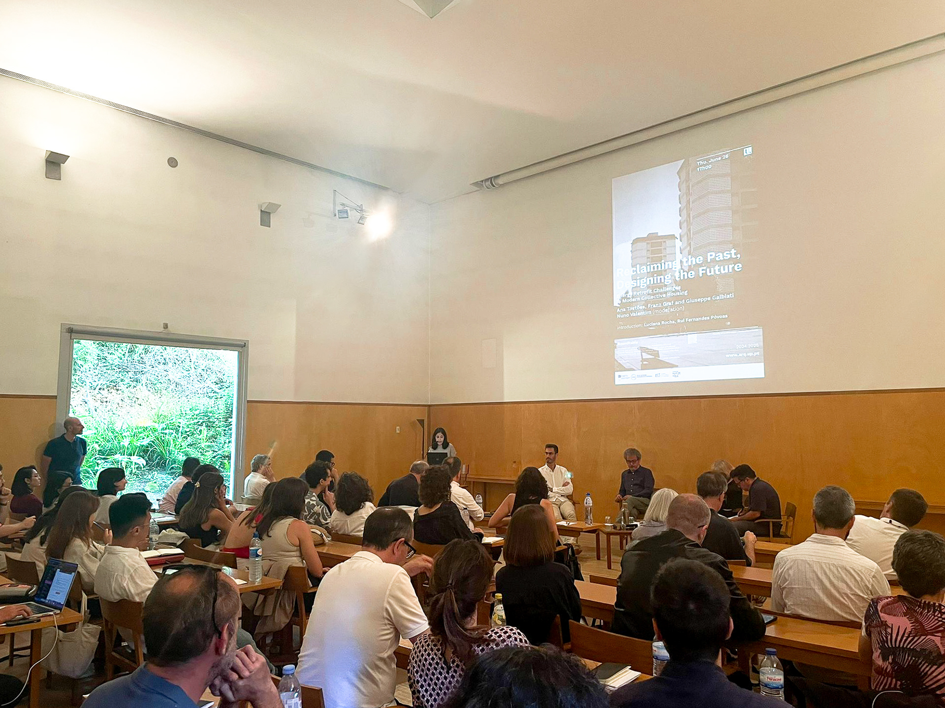 With the participation of Ana Tostões, Franz Graf and Giuseppe Galbiati, the roundtable “Reclaiming the Past, Designing the Future”, moderated by Nuno Valentim, proposed a critical reflection on the preservation of modern collective housing heritage and energy performance demands, highlighting economic and regulatory constraints, the contribution of interdisciplinary decision-support methodologies, and the role of digital tools and energy simulations in guiding retrofit strategies.